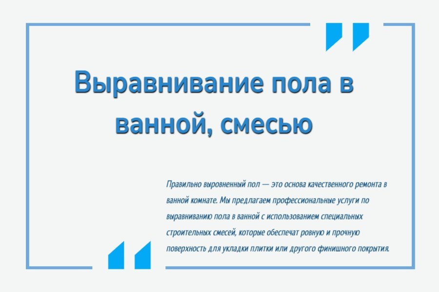 Правильно выровненный пол — это основа качественного ремонта в ванной комнате. Мы предлагаем профессиональные услуги по выравниванию пола в ванной с использованием специальных строительных смесей, которые обеспечат ровную и прочную поверхность для укладки плитки или другого финишного покрытия.